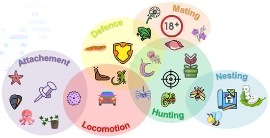 - Wilks, A.M.; Rabice, S.R.; Garbacz, H.S.; Harro, C.C.; Smith, A.M. Double-Network Gels and the Toughness of Terrestrial Slug Glue. J. Exp. Biol. 2015, 218 Pt. 19, 3128–3137. [Google Scholar] [CrossRef]