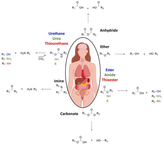 In this context, surgical adhesives have emerged as promising alternatives capable of overcoming these challenges (Figure 1). These glues are non-invasive, easy to use, and fast to apply [5]. Additionally, some formulations serve dual purposes as hemostatic agents to help control bleeding [6]. Adhesives are defined as non-metallic materials capable of creating durable bonds between surfaces. Surgical adhesives, in particular, are designed to bond tissues or affix implantable biomaterials, and can be composed of a wide range of compounds, including synthetic polymers and natural materials of animal or plant origin [7,8]. The chemical functionalities susceptible to physiological degradation are shown in Scheme 1. The physiological degradation of surgical adhesives is governed by a combination of hydrolytic, oxidative, and enzymatic mechanisms, which act in parallel or sequentially depending on the chemical structure of the adhesive and the specific biological environment. Hydrolytic degradation primarily affects ester, amide, and urethane bonds through nucleophilic attack by water molecules, a process that is significantly influenced by local pH. While ester bonds are typically labile in neutral to slightly basic environments (e.g., blood plasma), amide hydrolysis is more prominent in acidic compartments such as lysosomes. In parallel, oxidative degradation targets sulfur-containing groups such as thiols and thioesters, which undergo oxidation in the presence of reactive oxygen species (ROS) such as hydrogen peroxide and superoxide radicals—molecules commonly produced during inflammatory responses or in metabolically active organs such as the liver and lungs. Lastly, enzymatic degradation involves cleavage by specific enzymes, including esterases, proteases, and ureases, that selectively hydrolyze functional groups such as urea, urethane, and peptide-like bonds. These enzymatic processes are organ- and tissue-specific, with higher activity in protease-rich environments such as chronic wounds, the gastrointestinal tract, and the liver. Together, these degradation pathways determine the bioresorption rate and biocompatibility profile of medical adhesives, making their careful design essential for safe and effective clinical applications.