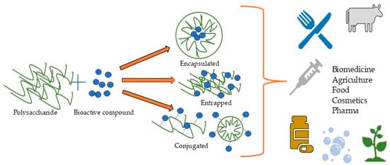 The combined factors of potential toxicity and immunogenicity aligned with the limited biocompatibility and accumulation risks of synthetic polymers combined with commercial interests have shifted focus toward biomass-derived biopolymers, which offer natural abundance and sustainable sourcing. Polysaccharides offer low immunogenicity and toxicity and excellent biocompatibility and biodegradability [19,20,21], and they are extensively utilized in biopolymeric nanoparticle fabrication [22,23], exhibiting not only superior mechanical and physicochemical properties but also intrinsic biological activity [24] that is often enhanced in nanoform. Bioactive compounds could be simply trapped, encapsulated, or conjugated with polysaccharides (Figure 1) [25]. Their nanoformulations as polysaccharide-based NPs can extend drug half-life, reduce cytotoxicity, and control release [26,27]. Polysaccharide-based nanoformulations serve as versatile delivery systems, material-reinforcing agents, and Pickering emulsion stabilizers for diverse applications including drug and gene delivery; antibacterial platforms; tissue engineering; cancer therapy; cosmetics; food fortification, preservation, and packaging; etc. [22,28,29,30,31].