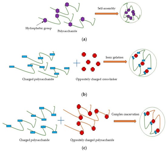 Self-assembly (Figure 3a) is one of the most promising techniques for nanoparticle synthesis due to its environmental friendliness, biocompatibility, process simplicity, and low toxicity [40]. This method involves the spontaneous organization of amphiphilic polysaccharides into ordered nanostructures with a hydrophobic core (for drug encapsulation) and a hydrophilic shell (for aqueous stability). The driving forces include non-covalent interactions such as hydrophobic effects, electrostatic forces, van der Waals interactions, and π–π stacking (in aromatic-modified systems) [36,40,197]. Chemical modification (e.g., grafting hydrophobic chains) can convert naturally hydrophilic polysaccharides into amphiphilic polymers, enabling controlled self-assembly [36]. Conversely, chemical modification involves the application of harmful reagents and could be inefficient and wasteful [198], therefore requiring subsequent purification steps, and it limits the potential of self-assembly for the industrial scale.