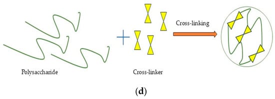 Schematic illustration of preparation process for polysaccharide nanoformulations: (a) self-assembly; (b) ionic gelation; (c) complex coacervation; (d) cross-linking.