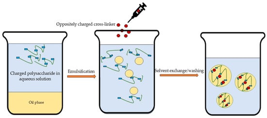 Complex coacervation (Figure 3c) occurs through electrostatic interactions between oppositely charged species, typically involving two oppositely charged polysaccharides [36,204]. Electrostatic complexation induces phase separation, forming a biopolymer-rich coacervate phase and a solvent-rich phase [205]. Ionic strength, pH, temperature, charge density, and polyelectrolyte molar mass critically influence coacervate particle stability and formation, while these systems also exhibit excellent biocompatibility and low toxicity [22]. The simplicity and safety of this method made it attractive for scaling up, but it requires careful consideration of numerous factors like mixing systems, polymer ratios and concentrations, temperature, pH, and balance in ionic strength [206].