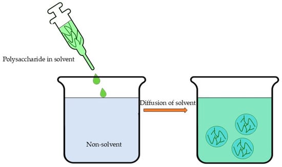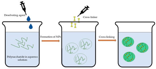 The desolvation technique (Figure 5) involves the coacervation or precipitation of dissolved polysaccharides through the gradual addition of desolvating agents (e.g., salts and alcohols). This process is typically followed by cross-linking to stabilize the formed nanoparticles [38,211]. The selection of desolvating agents depends on the encapsulated substance’s properties [22] but may require a subsequent purification step due to the potential toxicity of residual molecules [36], which could limit its scaling-up ability. The desolvation method is typically used for protein nanoparticle preparation, but there is a lack of systematic studies on this approach for polysaccharides, particularly regarding physical stability [212]. However, the desolvation technique followed by cross-linking could be successfully applied for the fabrication of polysaccharide NPs [213].
