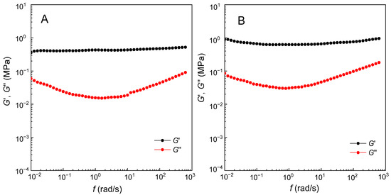 Rheological data of frequency sweeps of (A) c-PDTA-DI-CNC10 and (B) c-PDTA-DI-CNC20.