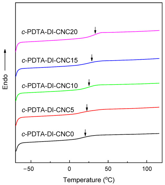 The thermal and mechanical properties of the nanocomposites were investigated through differential scanning calorimetry (DSC). Shown in Figure 5 are the DSC curves of the control networks derived from various dithiols. The single glass transitions were displayed in all of these cases, indicating the homogeneity of the networks. Notably, the glass transition temperatures (Tg’s) were quite dependent on the structures of the dithiols used. From c-PDTA-DI, c-PDTA-TH, c-PDTA-DE and c-PDTA-HE networks, the Tg’s were measured to be 27.8, 33.6, 37.8 and 48.0 °C, respectively. The increase in Tg’s is readily associated with the decrease in the molecular weights (or molecular sizes) of dithiols. The lower the molecular weights of dithiols, the higher the crosslinking densities of c-PDTA networks. As a result, c-PDTA-HE displayed the highest Tg. The incorporation of CNCs also led to an increase in the Tg’s. Taking the nanocomposites of c-PDTA-DI-CNCs, for instance, the DSC measurements were carried out, and DSC curves are shown in Figure 6. Notably, the Tg’s increased with the increment of the contents of CNCs. For the c-PDTA-DI-CNC0 network, the Tg was 20.9 °C. The incorporation of 20 wt% of CNCs resulted in the Tg being enhanced to 32.7 °C. The increase in Tg’s is attributable to the nanoreinforcement of the fibrous cellulose crystals on the matrix of c-PDTA-DI and the additional crosslinked sites.