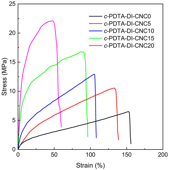 Stress–strain curves of c-PDTA-DI-CNC nanocomposites.