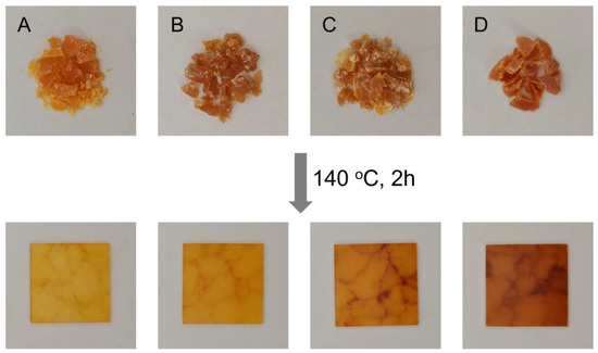 Photographs of (A) c-PDTA-DI-CNC5, (B) c-PDTA-DI-CNC10, (C) c-PDTA-DI-CNC15 and (D) c-PDTA-DI-CNC20 for reprocessing tests.
