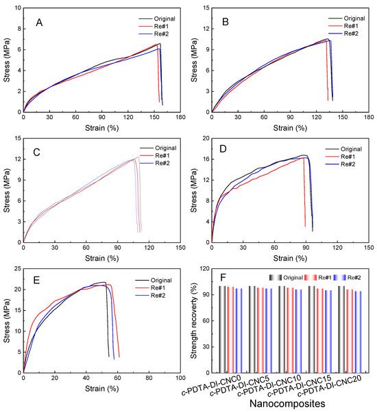 Stress–strain curves of (A) c-PDTA-DI-CNC0, (B) c-PDTA-DI-CNC5, (C) c-PDTA-DI-CNC10, (D) c-PDTA-DI-CNC15 and (E) c-PDTA-DI-CNC20 before and after reprocessing. (F) Recovery of mechanical strengths of the nanocomposites.