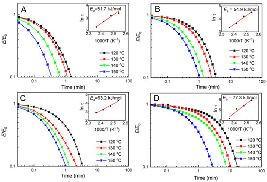 Stress relaxation curves of (A) c-PDTA-DI, (B) c-PDTA-TH, (C) c-PDTA-DE and (D) c-PDTA-HE.