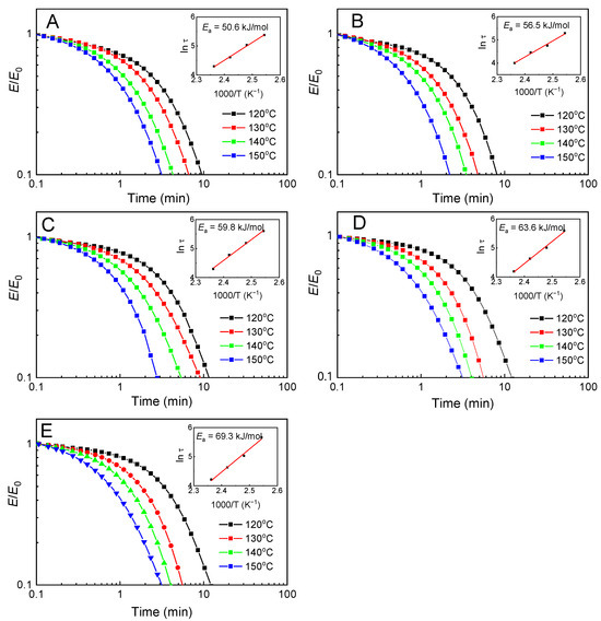 Stress relaxation curves of (A) c-PDTA-DI-CNC0, (B) c-PDTA-DI-CNC5, (C) c-PDTA-DI-CNC10, (D) c-PDTA-DI-CNC15 and (E) c-PDTA-DI-CNC20.