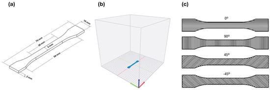 (a) Print orientation; (b) specimen dimensions according to the ISO 527-2 (2012) Type 1A standard; and (c) pattern orientation of the layers.