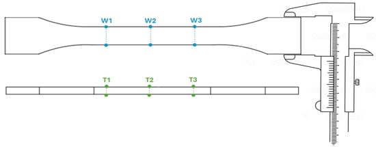 Ten specimens were produced and measured for each printing temperature. Each specimen had a gauge cross-sectional area of 5 mm × 2 mm (width × thickness), as shown in Figure 1b. Width and thickness measurements were taken at three different locations on each specimen, as illustrated in Figure 2, using a digital micrometer with an accuracy of ±0.01 mm. The average of these three measurements was compared to the CAD dimensions to evaluate dimensional accuracy. To assess the effect of printing temperature on the dimensional accuracy of the specimens, the measured dimensions were compared with the CAD dimension values. The absolute and dimensional errors were calculated using Equations (1) and (2), respectively. To quantify the variation, standard deviations were calculated for each set of measurements.