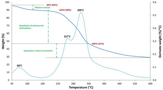 Figure 3 presents the thermogravimetric analysis curves of CSS, where the bold line represents the weight loss and the dashed line represents the derivative weight loss. A three-step thermal degradation process is observed in CSS. The first weight loss, starting around 40 °C, is attributed to moisture evaporation, accounting for approximately 6% of the total weight loss. The second degradation stage shows a significant weight loss of about 43% due to the degradation of cellulose and hemicellulose components. The subsequent weight loss step, occurring above 340 °C, is attributed to the breakdown of lignin and proteins []. The derivative thermogram (DTG) peaks indicate the rate of temperature-dependent weight loss. When heating the CSS fillers, a deterioration peak around 68 °C corresponds to moisture removal. The thermal decomposition of hemicellulose and cellulose is represented by degradation peaks at 257 °C and 309 °C, respectively []. These results show that CSS has thermal stability like common natural fibers, with an onset decomposition temperature of about 210 ± 10 °C, indicating its suitability for processing with PLA as the processing temperature range of this polymer is well within this limit [].