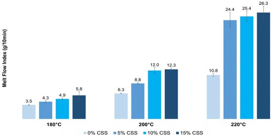 To evaluate the effect of CSS on the fluidity of the PLA matrix, the melt flow index of all prepared composites was measured using DAVENTEST equipment. The test was conducted with a 2.16 kg load at three different printing temperatures: 180 °C, 200 °C, and 220 °C. Three measurements were taken for each condition and the average MFI values along with their standard deviations were reported.