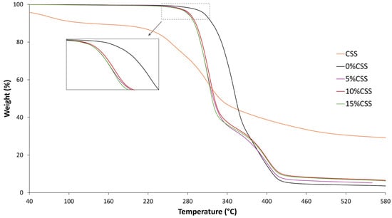 Figure 5 illustrates the TGA curves of PLA-CSS composites comprising different filler loading from 0 to 15 wt%. All composites exhibit similar weight loss behavior as the neat polymer up to 220 °C. Beyond this temperature, the onset of degradation temperature slightly decreases with the addition of CSS filters. Similar observations have been reported in studies involving natural-fiber-reinforced PLA composites, where the thermal degradation characteristics are significantly influenced by the introduction of less thermally stable natural materials [,,].