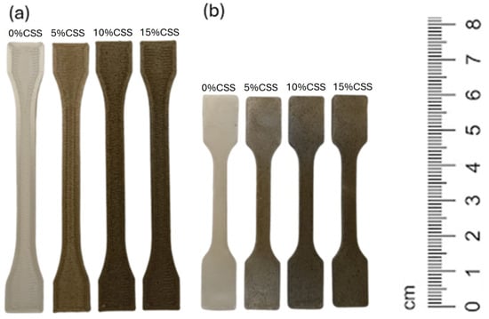 The microstructure of the PLA-CSS composites was analyzed using a Leica DMS 1000 Stereo Microscope. Specimens printed at three different temperatures were bisected to examine their cross-sectional areas. Images were obtained using a Leica MTV-3 digital camera and then analyzed with Leica Application Suite software (version 4.13.0).
