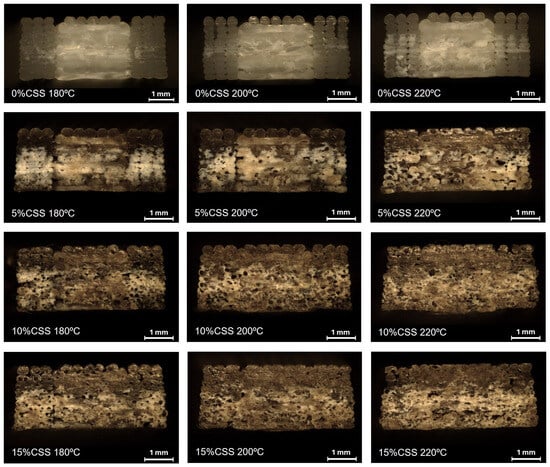 Regarding the influence of printing temperatures, the images suggest that higher temperatures improve layer fusion, as seen by the absence of distinct filament boundaries in specimens printed at 200 °C and 220 °C. According to Spoerk et al., higher temperatures are critical for achieving a balance between melt printability and raster bonding and avoiding feedstock degradation []. While higher temperatures generally enhance interlayer adhesion by increasing polymer chain mobility and diffusion, the presence of fillers like CSS and the formation of imperfect crystalline structures in the matrix may hinder polymer chain movement. This can reduce interface diffusion, potentially affecting the overall quality of the printed part. As seen in the MFI results, CSS likely acts as a plasticizer, increasing the flowability of the PLA matrix. This plasticization effect may mitigate void formation, especially at higher CSS contents, leading to denser printed parts. This observation is consistent with the literature, stating that the addition of plasticizers or flow-enhancing fillers typically reduces void formation and leads to denser printed parts []. Nevertheless, when the nozzle temperature becomes too high, the extruded filament may become excessively fluid, causing layer overlaps and resulting in suboptimal print quality [].