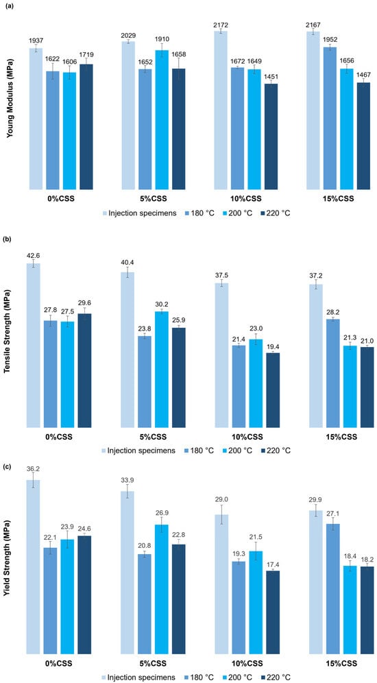 The overall average results of the mechanical properties are presented in Figure 8. The elastic modulus of injection-molded specimens increases with higher CSS content, primarily due to the incorporation of rigid lignocellulosic fillers that limit polymer chain mobility and increase material elastic modulus []. Injection-molded specimens consistently exhibit higher elastic modulus values than 3D-printed ones across all compositions and printing temperatures, largely because of weaker interlayer adhesion. Voids and weak interfaces in 3D printing can significantly reduce overall elastic modulus. In FFF-printed specimens, elastic modulus is influenced by printing and CSS content. At lower concentrations (up to 5% CSS), the effect of temperature on elastic modulus is minimal. Notably, the elastic modulus for 5% CSS at 200 °C approximates that of virgin injection-molded material, indicating an optimal balance between interlayer adhesion and filler dispersion. On the other hand, for higher CSS levels, elastic modulus decreases as the printing temperature rises. Cross-sectional images suggest increased particle agglomeration at these higher temperatures, creating microstructural defects that hinder load transfer and reduce elastic modulus. This increase in agglomeration can be attributed to the decreased viscosity of the molten composite at higher temperatures, which allows particles to migrate and cluster more easily. However, at lower CSS levels (5% CSS), better filler dispersion results in a more uniform stress distribution, leading to higher modulus values. Previous studies have reported that the incorporation of fillers modifies the polymer phase by forming an adsorbed polymer interphase at the filler surface. The degree of reinforcement achieved by adding fillers depends on several factors, including filler volume fraction, surface area, particle shape, adhesion quality between the filler and polymer, and the characteristics and thickness of the interphase formed between the two phases []. These factors justify the distinct behavior of the composite materials in this study.