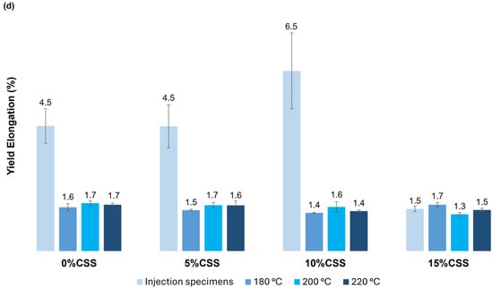 Yield strength also declines with increasing CSS content, mirroring the trends observed in tensile strength. Comparing injection-molded and 3D-printed specimens, the inherent weaknesses introduced by the FFF process become evident, especially at higher filler contents. Injection-molded specimens show significantly higher yield strength due to the more uniform distribution of CSS particles and the absence of layer-related defects that are typical in 3D-printed parts. Among printed specimens, those produced at 200 °C exhibit slightly higher yield strength than those printed at 180 °C. This improvement is likely due to better interlayer adhesion and reduced porosity, as seen in the cross-sectional images. However, CSS agglomeration limits the benefits of higher temperature on yield strength, particularly at 10% and 15% CSS content, where larger CSS clusters reduce the material’s load-bearing capacity.