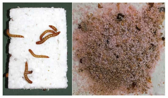 The specimens of the insect species Tenebrio molitor L. have been grown and maintained in the laboratory of the University of Belgrade Institute for Multidisciplinary Research on the natural food source (wheat flour), and the obtained larvae were used in the experiment. Twenty larvae L5 stage were placed in each of the two plastic boxes with a volume of 5 L, and two types of polystyrene foam were added separately in each box as the sole food source: styrofoam, expanded polystyrene (EPS), and styrodure, extruded polystyrene (XPS) (Figure 1). Both types of polystyrene were in the form of a thick sheet cut into irregular cube-shaped pieces a few centimeters in size (Figure 2). Larvae in two plastic boxes were incubated in the dark at room temperature, around 23–25 °C and 70% humidity for 6 weeks. For the time given, 80% of larvae survived and were transformed into imago, while 20% did not manage to complete the entire life cycle and eventually died. The insect larvae’ frass was collected, analyzed, and used as a substrate in experiments with fungi (Figure 2).