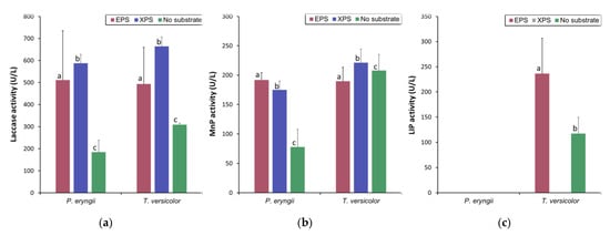 The enzyme activities measured in the media of Pleurotus eryngii and Trametes versicolor ((a) laccase activity in fungal mycelia; (b) Mn-peroxidase activity in fungal mycelia; (c) lignin peroxidase activity in fungal mycelia; EPS—expanded polystyrene, styrofoam; XPS—extruded polystyrene, styrodure). a, b, c are statistical classes indicating statistical significance of the differences between enzyme activities.