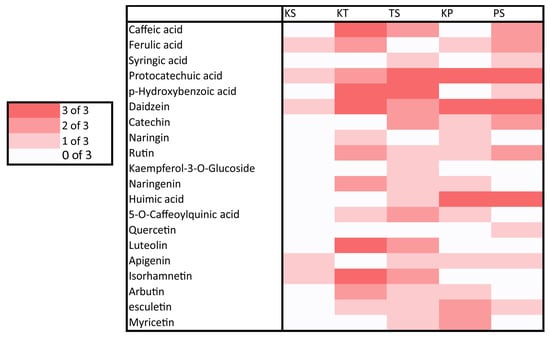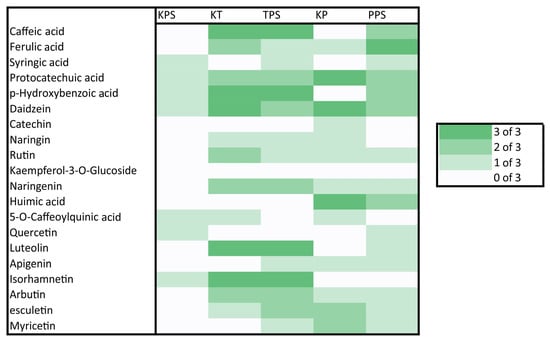 Detection frequency of phenolic compounds in methanolic extracts of T. versicolor and P. eryngii cultivated on larval frass derived from XPS. Detection was based on LC-MS analysis across three biological replicates per condition. Darker shades indicate consistent compound presence (3/3), while lighter shades and white reflect variable or absent detection.