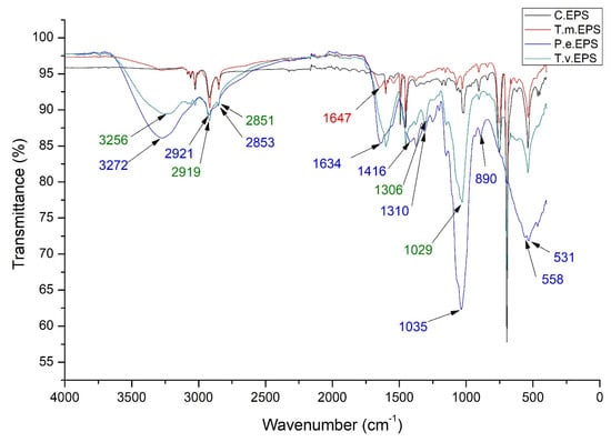 The FTIR spectrum of larval frass derived from expanded polystyrene and presented in Figure 6 (T.m. EPS) had a similar profile to the untreated polystyrene control. In addition to minor changes in the intensity of the peaks, one new peak that was not present in the control FTIR spectrum can be observed at 1647 cm−1 (Figure 6). In the FTIR spectra after incubation with two fungal species, significant differences can be observed, both concerning the control and polystyrene after passing through the digestive system of insects and to the two fungal species. After incubation with fungi P. eryngii (Figure 6, P.e.EPS), a loss of peaks at 3082, 3060, 3026, 1493, and 1452 cm−1, as well as the emergence of new peaks at 3272, 1634, 1416, 1310, and 558 cm−1 can be observed in the FTIR spectrum. Shifts in absorption peaks were evinced from 2917 to 2921 cm−1, 2848 to 2853 cm−1, 1028 to 1035 cm−1, 907 to 890 cm−1, and 538 to 531 cm−1. After incubation with T. versicolor (Figure 6, T.v.EPS), new peaks can be observed in the FTIR spectrum at 3256 and 1306 cm−1 and a shift in absorption peaks from 2917 to 2919 cm−1, 2848 to 2851 cm−1, and 1028 to 1029 cm−1.