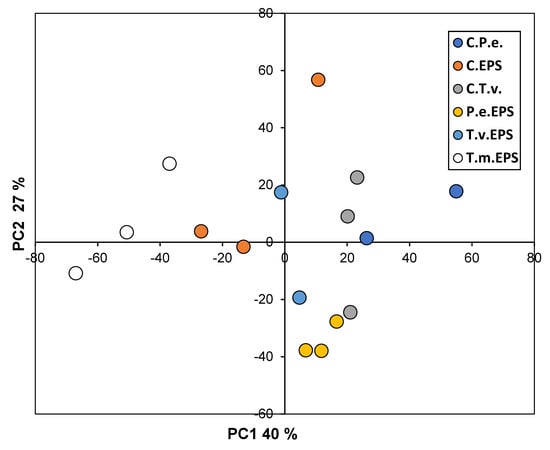 The score plot of the first two principal components (PC1 and PC2) obtained from PCA of FTIR spectra of treatments based on EPS The plot shows treatment distribution based on spectral similarity in the regions 400–1800 cm−1 and 2800–3700 cm−1. PC1 and PC2 together explain 83% of the total variance. (C.EPS—expanded polystyrene control; T.m.EPS—polystyrene after the digestive system of T. molitor larvae; P.e.EPS—polystyrene in insect frass treated with P. eryngii; T.v.EPS—polystyrene in insect frass treated with T. versicolor; C.P.e.—control of mycelia of Pleurotus eryngii; C.T.v.—control of mycelia of Trametes versicolor).