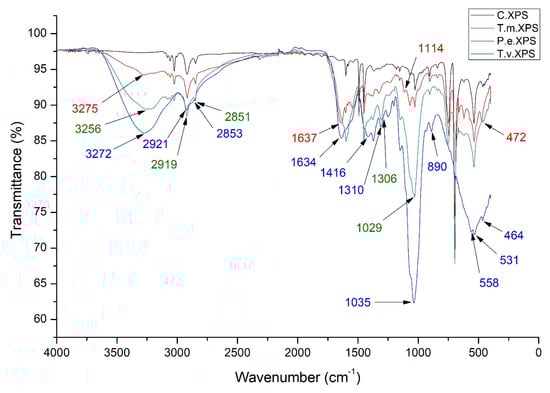 Average FTIR spectra of experimental treatments with extruded polystyrene (C.XPS—untreated extruded polystyrene control; T.m.XPS—polystyrene after the digestive system of T. molitor larvae; P.e.XPS—polystyrene in insect frass treated with P. eryngii; T.v.XPS—polystyrene in insect frass treated with T. versicolor).