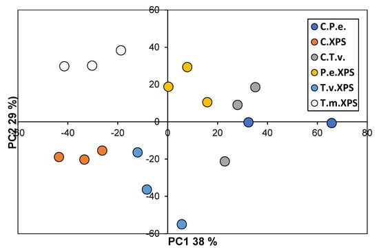 Principal component analysis (PCA) score plots based on FTIR absorbance spectra of fungal samples grown on polystirene were able to distinguish clearly between the polymer structures of different treatments (Figure 7 and Figure 9). As expected, samples from the C.P.e. and C.T.v.—the spectra of fungal mycelia exhibited the highest scores along PC1, indicating pronounced spectral differences from the other treatments, which are more closely clustered along this axis. Interestingly, spectra of T. molitor treatment exhibited the lowest scores along PC1, including C.EPS, indicating a very different mechanism of PS destruction in comparison to fungal treatments (Figure 7). Fungal treatments, on the other hand, differed significantly from the C.EPS, as well as from fungal controls (Figure 7). The pattern in the distribution of spectral profiles for the control and treatments with extruded polystyrene (XPS) showed similarities to that observed in the case of EPS treatments. However, PC2 made a clear differentiation between T.m.XPS and C.XPS, as well as between P.e.XSP and T.v.XSP. The observed lack of LP activity in T. versicolor treatment with XSP (Figure 3c) may be an explanation of such differences and the proximity of T.v.XSP spectra to C.XSP, as well as a difference between the spectra of the two fungal treatments.
