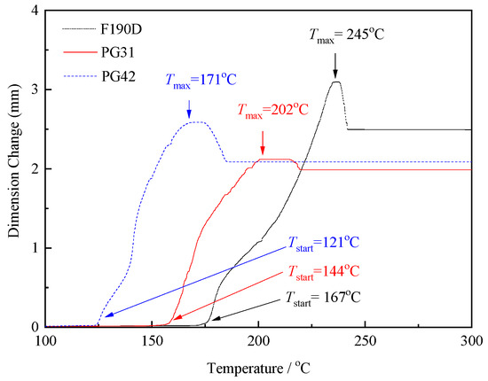 The expansion temperature and the expanding behaviors of TEMs were characterized by thermomechanical analysis (TMA-4000, PerkinElmer, Waltham, MA, USA). A sample (25 µg) was put into a cup and heated from ambient temperature to 250 °C at a rate of 5 °C·min−1. The temperature at which the expansion started is called Tstart (measured by TMA), whereas the temperature at which the maximum expansion was reached is called Tmax (measured by TMA). The change in dimension at which the maximum expansion was reached is called Dmax (measured by the TMA).