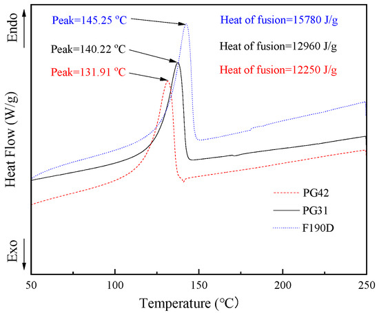 Furthermore, as illustrated by the DSC curve in Figure 2, with the increasing temperature, distinct endothermic peaks emerged on the DSC curves. The endothermic peak temperature was highest for F190D, followed by PG31, and was lowest for PG42, which aligned with the findings from the TMA curve analysis. Notably, the onset temperature of the endothermic peak was significantly lower than the Tstart observed in the TMA results. This suggested that prior to the expansion of the TEMs, the alkanes within the core material undergo endothermic vaporization. However, at this stage, the shell polymer had not yet reached its viscoelastic state, maintaining a relatively high mechanical strength. Consequently, the outward expansion pressure generated by the vaporization remained lower than the mechanical strength of the polymer shell, preventing any volumetric changes in the microspheres. As the temperature continued to rise, the shell polymer entered a viscoelastic state, leading to a reduction in its mechanical strength while enhancing its elasticity. At this point, the outward expansion pressure caused by the alkane vaporization exceeded the mechanical strength of the shell polymer, initiating the outward expansion of the microspheres.