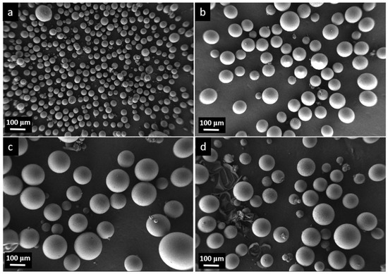 As illustrated in Figure 3, for PG31 the average diameter prior to expansion was approximately 30–40 μm (Figure 3a). As the temperature increased, the average diameter began to gradually increase and reached a peak value of around 140 μm at 200 °C (Figure 3c). When the temperature rose to 220 °C, some alkanes escaped from the polymer shell, causing the microspheres to shrink or even rupture (Figure 3d). This observation aligned with the findings presented in Figure 1.