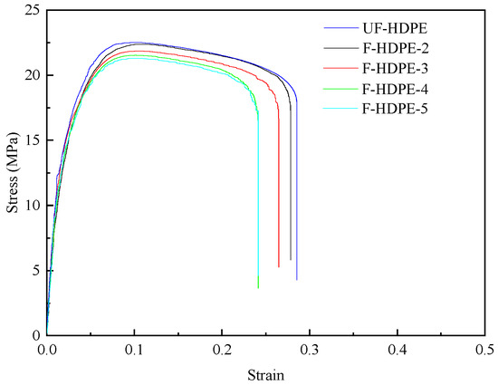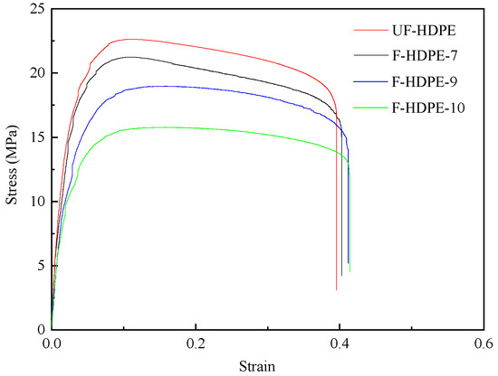 The representative stress–strain curves of unfoamed and foamed HDPE samples are featured in Figure 10. Table 5 tabulates the values of Young’s modulus, the ultimate strength, and the strain at break of tensile bars. As shown in Figure 10 and Table 5, the density of foamed samples reduced with the increasing TEMs content. The Young’s modulus and ultimate strength of unfoamed HDPE samples were higher than their foamed counterparts. By adding TEMs to the samples, the foamed structure with expanded TEMs affected the mechanical properties. With the increasing TEMs content, the Young’s modulus and ultimate strength of the foamed HDPE decreased sharply (from 1330.1 MPa and 22.8 MPa to 839.1 MPa and 15.8 MPa, respectively), while the strain at break was improved (from 37.06% to 41.39%). The degradation of mechanical properties was attributed to the presence of voids originating from TEM cells within the samples, which significantly diminished the effective cross-sectional area of the tensile test samples. At an ambient temperature, the amorphous regions of HDPE exhibit a rubbery state. As the content of TEMs increased, the crystallinity of the foamed HDPE decreased (as shown in Table 6), leading to a reduced tightness in the molecular chain arrangement and increased porosity. Upon impact, the activity space of the molecular chain segments expanded, resulting in an enhanced impact strength and an increased strain at break.