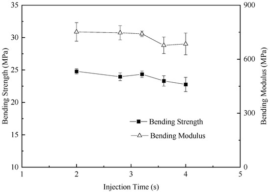 The variations in the bending modulus and bending strength as functions of the injection time are summarized in Figure 5. The bending modulus and bending strength of the foamed samples increased with the decrease in the injection time, resulting from the increasing of the cell sizes in foamed samples. Unlike traditional open-cell HDPE foam, when TEMs expand within HDPE, if the TEMs remain intact, they can form a closed-cell structure. Additionally, the shell of the TEMs exhibits a certain degree of compressive deformation resistance, which can effectively disperse stress under bending forces, preventing a localized stress concentration and thereby enhancing the material’s bending strength to some extent.
