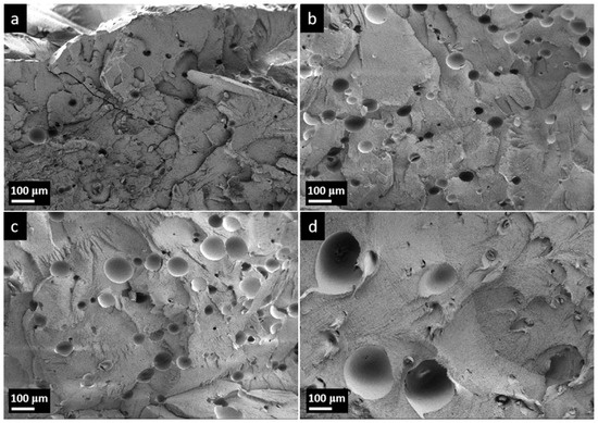 To investigate the effects of the nozzle temperature on the microstructure of foamed samples, the cryogenically fractured cross-sectional morphologies of the injection-molded tensile bars were examined using scanning electron microscopy (SEM). The microstructure is shown in Figure 6, and the cell size and cell density are summarized in Table 3. The cell size increased from 59.53 μm to 127.44 μm, while the cell density decreased with the rising nozzle temperature. It is important to highlight that, in comparison to the expansion in air (shown in Figure 3), the microsphere diameter in the HDPE resin is considerably smaller prior to the microsphere rupture (before 200 °C). Conversely, the bubble diameter in foamed HDPE becomes significantly larger following the microsphere rupture (after 200 °C). Due to the inherent viscosity of the HDPE melt at high temperatures, it exerts a certain degree of external pressure on the expansion of microspheres, thereby restricting their volume expansion to a certain extent. Consequently, the diameter of microspheres after expanding within HDPE was smaller compared to those that expanded in air [28]. As the temperature increases, HDPE transitions from a glassy state to a melted state, thereby reducing the binding effect on the expansion behavior of TEMs. Simultaneously, the alkanes encapsulated by TEMs had transformed from a liquid to a gas, ultimately leading to the expansion of TEMs in the HDPE melt and the formation of the foam. However, it can be observed from Figure 6d that part of the cell size is even smaller than in Figure 6a, and the shell of the TEMs after the rupture and contraction can be seen in the hole. Although the higher temperature was conducive to improving the expansion efficiency of TEMs, once the temperature reached 220 °C, which was significantly higher than the Tmax (202 °C, shown in Figure 1) of PG31, portions of the TEMs began to fracture and contract. The low-boiling alkanes coated in the microspheres escaped into the resin matrix, and a portion of the melt resin infiltrated the voids created following the rupture of the microspheres, leading to a decrease in the uniformity of cell sizes.