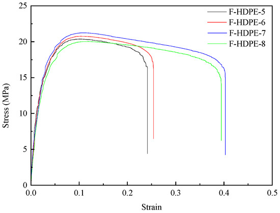 The representative stress–strain curves of foamed samples with different injection times were featured in Figure 4. The stress–strain curves of HDPE samples can be categorized into two distinct stages. In the initial phase of the stress–strain curve (strain less than 10%), the material exhibits a Linear Elastic Region, where the stress increases linearly with the strain. During this stage, the sample undergoes uniform stretching in accordance with Hooke’s law, and the slope of the curve represents Young’s modulus. Upon reaching the maximum stress value (yield stress), the cross-sectional area of the sample becomes abruptly uneven, forming one or more “necking” regions, thereby transitioning into the second stage. In this stage, stress gradually decreases while the strain continues to increase until the sample fractures. With decreasing injection times, the density of the foamed HDPE diminished, leading to a reduction in material stiffness as evidenced by a decrease in the linear slope (Young’s modulus) during the linear elastic stage and a reduction in yield stress. However, the incorporation of TEMs introduced interfacial defects within the HDPE matrix. As tensile deformation progresses into the second stage, these defects further reduce the stress and strain of the foamed HDPE. Additionally, lower densities of foamed HDPE correspond to larger cell diameters, which result in reduced stress and strain values.