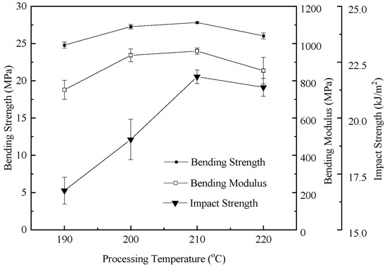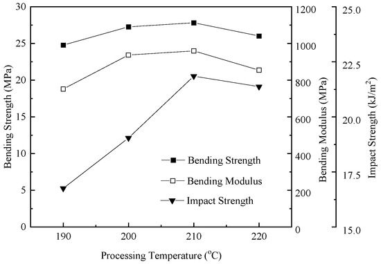 Figure 8 shows the bending and impact strength variation in foamed samples with respect to the nozzle temperature. The bending strength, bending modulus, and impact strength showed a trend of increasing first and then decreasing with the raising nozzle temperature. This can be inferred to the growing cell size in the foamed samples. In general, the cell morphology had a strong relationship with the mechanical properties. To improve the impact strength, the cell morphology had to consist of a well-developed uniform microcellular structure with a small cell size and a high cell-population density [29]. However, as shown in Figure 3d and Figure 6d, when the temperature reached 220 °C, a portion of TEM shells were broken and lost elasticity, resulting in the non-uniform microcellular structure in foamed HDPE. Thus, the dimensional stability of the foamed samples was affected when subjected to bending stress.