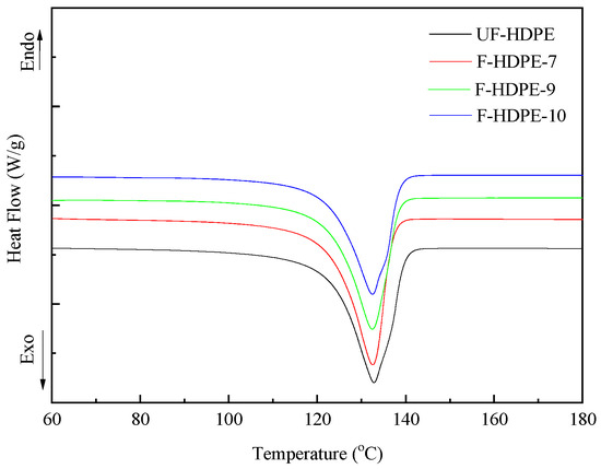 From the figure and table, it can be inferred that the degree of the crystallinity of foamed samples remarkably decreased from 62.78% to 53.81%, while the TEMs content increased from 0 to 4.5 wt.%. This can be attributed to the presence of TEMs which hindered the growth of polymer crystals, resulting in the lower degree of crystallinity. And the melting (peak) temperature of foamed samples decreases gradually from 116.89 °C to 113.91 °C with the increased TEMs content. The melting peak onset temperature and melting end point shift towards lower temperature when TEMs were added to HDPE matrix, while those remain nearly unchanged with the increased TEMs content. The difference between the melting end point and onset temperature could represent the broadness of a melting regime. These differences for UF-HDPE, F-HDPE-7, F-HDPE-9, and F-HDPE-10 are 30.80, 34.42, 34.60, and 34.08, respectively. Hence, a significant broadening in the melting regime was noticed for the foamed HDPE. And it can be stated that the size distribution of crystals is wider than the pure materials.