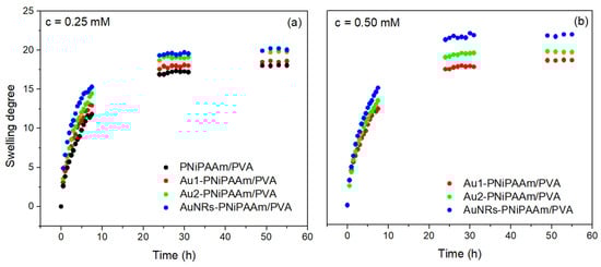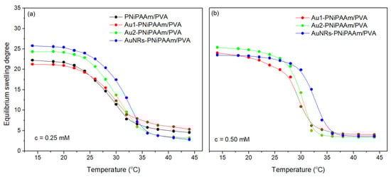 - Radojković, N.; Spasojević, J.; Kačarević-Popović, Z.; Stamenović, U.; Vodnik, V.; Roglić, G.; Radosavljević, A. Thermo-Responsive and Electroconductive Nano Au-PNiPAAm Hydrogel Nanocomposites: Influence of Synthesis Method and Nanoparticle Shape on Physicochemical Properties. Polymers 2024, 16, 3416. [Google Scholar] [CrossRef]