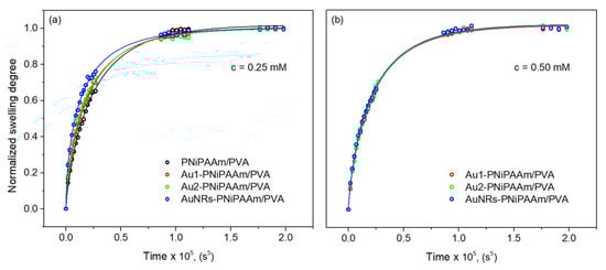 - Zhao, Z.X.; Li, Z.; Xia, Q.B.; Bajalis, E.; Xi, H.X.; Lin, Y.S. Swelling/deswelling kinetics of PNIPAAm hydrogels synthesized by microwave irradiation. Chem. Eng. J. 2008, 142, 263–270. [Google Scholar] [CrossRef]