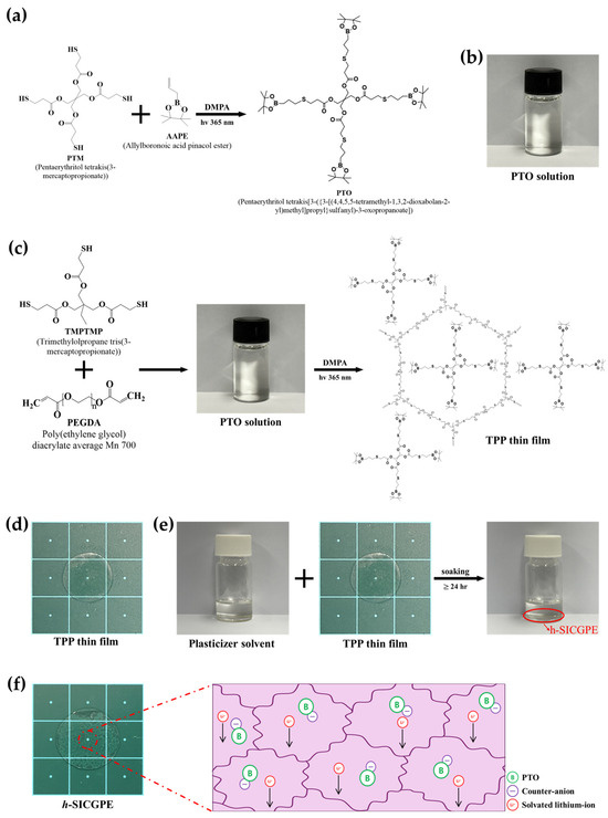 For synthesizing h-SICGPE, nine kinds of materials were used as follows: Pentaerythritol tetrakis(3-mercaptopropionate) (PTM, Sigma-Aldrich, St. Louis, MO, USA), allylboronic acid pinacol ester (AAPE, Sigma-Aldrich), trimethylolpropane tris(3-mercaptopropionate) (TMPMP, Sigma-Aldrich), poly(ethylene glycol) diacrylate average Mn 700 (PEGDA, Sigma-Aldrich), 2,2-dimethoxy-2-phenylacetophenone (DMPA, Sigma-Aldrich), acetonitrile (ACN, SAMCHUN CHEMICAL, Seoul, Republic of Korea), ethylene carbonate (EC, TCI, Tokyo, Japan), propylene carbonate (PC, TCI), and lithium bis(trifluoromethanesulfonyl)imide (LiTFSI, MTI, Richmond, CA, USA).