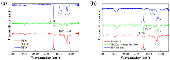 To analyze the developed h-SICGPE structure of the cross-linked polymer network incorporating anion receptors, Figure 2a,b show the FT-IR spectra of the synthesized PTO solution and solid-state TPP thin film (with thickness of 245 μm) mentioned in Figure 1a,c. In the (green line) spectrum of the AAPE used for synthesizing the PTO solution (i.e., anion receptor), the C=C stretching peaks appear near 1635 cm−1, and disappear in the (blue line) spectrum of the synthesized PTO. This means that the C=C bonds in AAPE are completely consumed in the thiol-ene click reaction [34,35,36,37]. Further, the B–O, C=O, and C–O stretching peaks originating from AAPE and PTM (red line) also appear in the PTO spectrum, confirming the successful formation of the desired structure [38,39,40]. In addition, the C=C stretching band near 1635 cm−1, observed in the (green line) spectrum of PEGDA (average Mn 700), disappears entirely in the (blue line) spectrum of the synthesized TPP thin film of Figure 1d, indicating full conversion of the acrylate groups in the photo-cross-linking process. Moreover, the clear presence of the characteristic B–O stretching band near 1350 cm−1 in the TPP thin film spectrum further confirms the successful incorporation of PTO into the polymer network. Furthermore, in the TPP thin film spectrum, the appearance of C=O and C–O bands observed from both TMPMP (red line) and PEGDA indicates the successful formation of cross-linking bonds between two monomers. Consequently, these FT-IR results can clearly assure the successful incorporation of anion receptors in the cross-linked TPP network.