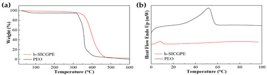 To evaluate the thermal properties of the proposed h-SICGPE, TGA and DSC analysis were performed and compared to typically well-known PEO electrolytes [41]. Figure 3a shows TGA curves demonstrating the thermal decomposition behaviors of both polymer electrolytes. The conventional PEO electrolyte sharply decomposes around 320 °C, while the designed h-SICGPE begins relatively gentle thermal degradation at approximately 363 °C. The h-SICGPE exhibits an enhanced thermal stability approximately 43 °C higher than PEO, which highlights its excellent thermal robustness suitable for practical battery applications. Figure 3b depicts DSC thermograms illustrating the thermal transition characteristics of the h-SICGPE. The melting temperature (Tm) of the h-SICGPE is significantly lower (8–10 °C) compared to the PEO electrolyte (~51 °C), which is attributed to the formation of the large (hexagonal) free volume and amorphous region of the polymer matrix for a greater ion transfer path in the cross-linked TPP network. Considering that the melting temperature typically appears higher than the glass transition temperature (Tg) and crystallization temperature (Tc), it can be inferred that both the Tg and Tc of the h-SICGPE are well below 25 °C. These low-temperature transitions (Tg, Tc, and Tm) below 25 °C ensure sufficient chain mobility and continuous ion transport pathways between anodes and cathodes of polymer-based battery cells. Importantly, no abnormal weight loss and thermal events appear in both analysis curves of the h-SICGPE, indicating complete conversion of monomers to the PTO and cross-linked TPP network described in Section 2.1.