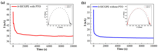 Figure 4a illustrates the CA results of the h-SICGPE incorporating PTOs (anion receptors) into the cross-linked TPP network, where the LITN is calculated using Bruce–Vincent Equation (2) based on current and impedance measurements before and after polarization [33]. The calculated LITN value is 0.805 significantly higher than LITN values reported for similar gel polymer electrolytes [42,43]. From the Nyquist plot shown in the inset of Figure 4a, it can be seen that the interfacial resistance between h-SICGPE and the Li electrode is very slightly increased from 4.487 to 4.491 Ω after CA measurement, indicating a stable and robust interfacial interface of the Li|h-SICGPE|Li symmetric cell. This stable interfacial behavior ensures an excellent electrochemical capability of the h-SICGPE to sustain strong concentration gradient recovery and mechanical integrity for a given potential. To clearly demonstrate the effectiveness of PTO-TPP network incorporation, as compared to an h-SICGPE without PTO (LITN = 0.333), shown in Figure 4b, the h-SICGPE with PTO exhibits an approximately 2.4 times higher LITN. This enhancement aligns well with the proposed mechanism wherein the boron atom’s Lewis acid sites in PTO immobilize counter-anions, thereby facilitating lithium-ion transport. This highlights the significant improvement in lithium-ion transport efficiency achieved through the rational design and synthesis of the PTO-integrated h-SICGPE in this work.