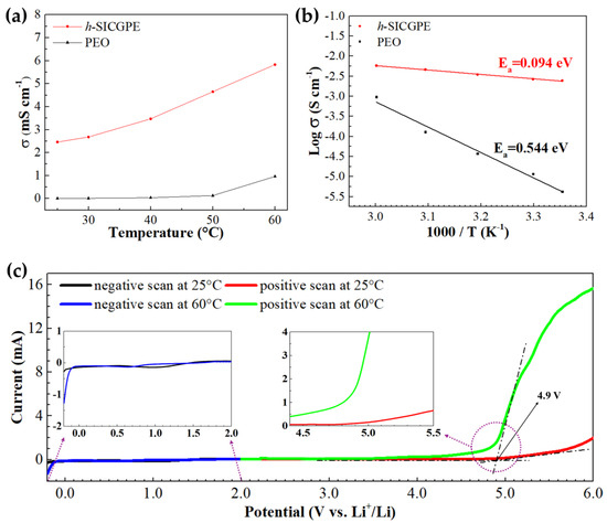(a) Ionic conductivities and (b) Arrhenius plot of ionic conductivities of h-SICGPE and PEO electrolyte at different temperatures; (c) LSV curves of h-SICGPE at 25 and 60 °C.