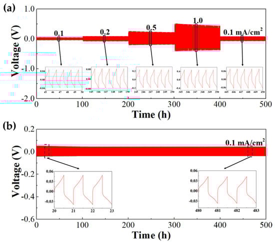 (a) Voltage-time profiles of the Li|h-SICGPE|Li symmetric cells at 25 °C for (a) 0.1, 0.2, 0.5, and 1.0 mA cm−2 (inset: middle five cycles) and (b) 0.1 mA cm−2 (inset: voltage profiles at the ranges of 20–23 h and 480–483 h).