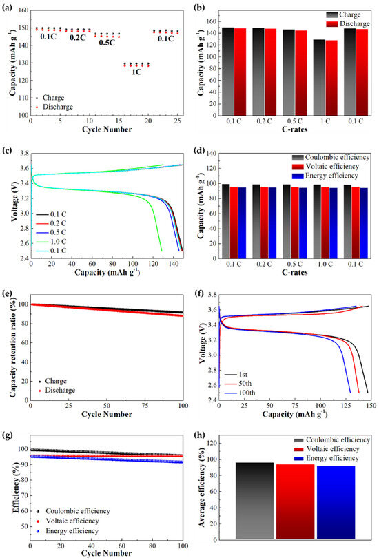 Performance profiles of the LFP|h-SICGPE|Li cell: (a) C-rate capability, (b) average capacity comparisons, (c) charge/discharge voltage profiles of the 1st cycle, and (d) average efficiencies at 0.1, 0.2, 0.5, 1.0, and 0.1C for five cycles each; (e) capacity retention rate for 100 cycles, and (f) charge/discharge voltage profiles at 1st, 50th, 100th cycle, (g) efficiency profiles for 100 cycles and (h) average efficiencies for 100 cycles.
