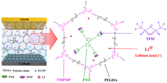 The key highlight of this study is to overcome the long-standing tradeoff between ionic conductivity and LITN in PEs operating at 25 °C. Conventional dual-ion conducting systems, including those based on PEO, often suffer from low LITNs [29]. This is primarily due to the high mobility of counter-anions, along with the strong coordination between lithium ions and ether oxygen atoms. These two factors cause concentration polarization and thereby promote the growth of lithium dendrites. To address these challenges, this paper deals with a novel h-SICGPE framework of a cross-linked polymer network backbone possessing anion receptors in its large free volumes, attributed to the long chain of PEGDA, where the h-SICGPE’s hexagonal structure is formed by the thiol-ene click reaction between PEGDA and TMPMP monomers in the PTO solution. The h-SICGPE, able to assure such remarkable performance in 25 °C, can be successfully achieved by incorporating PTO (anion receptor) into the free volume of the cross-linked TPP network. The PTO with a robust cross structure is a boronate-functionalized anion receptor capable of efficiently and effectively suppressing the mobility of anionic species and enhancing LITNs in the h-SICGPE, which strongly traps counter-anions via Lewis acid–base interactions and π-complexation. Further, the cross-linked TPP network with a homogeneous hexagonal cell structure significantly enhances ionic conductivity and provides robust mechanical integrity by strongly suppressing crystallinity and expanding the amorphous region. Notably, the TPP polymer matrix incorporates both ether and ester functionalities, allowing for balanced lithium coordination and improved segmental mobility [30]. The synergistic effect of incorporating the PTO receptor in the hexagonal-cell structure of the cross-linked TPP network offers a viable pathway toward realizing SICGPEs with outstanding electrochemical performance and stability at 25 °C. Scheme 1 shows the summarized chemical composition and network of the h-SICGPE.