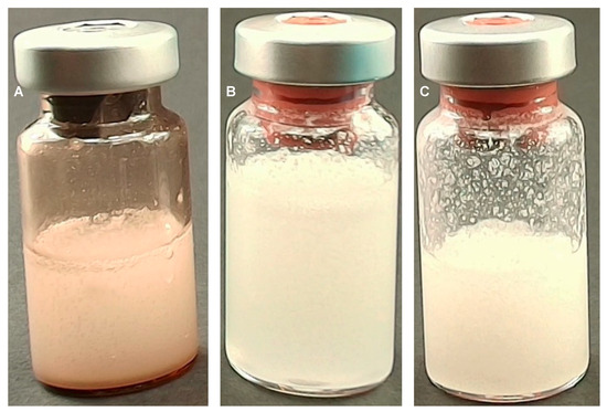 PLLA-SCA: Reconstitution requires more intensive shaking. Immediately after mixing, a two-phase mixture forms, consisting of a milky-white solution and white foam. Additionally, there is significant settling of precipitated white particles on the vial walls. This phenomenon occurs regardless of whether 5 mL or 8 mL of water is used for reconstitution (Figure 1B,C, respectively).